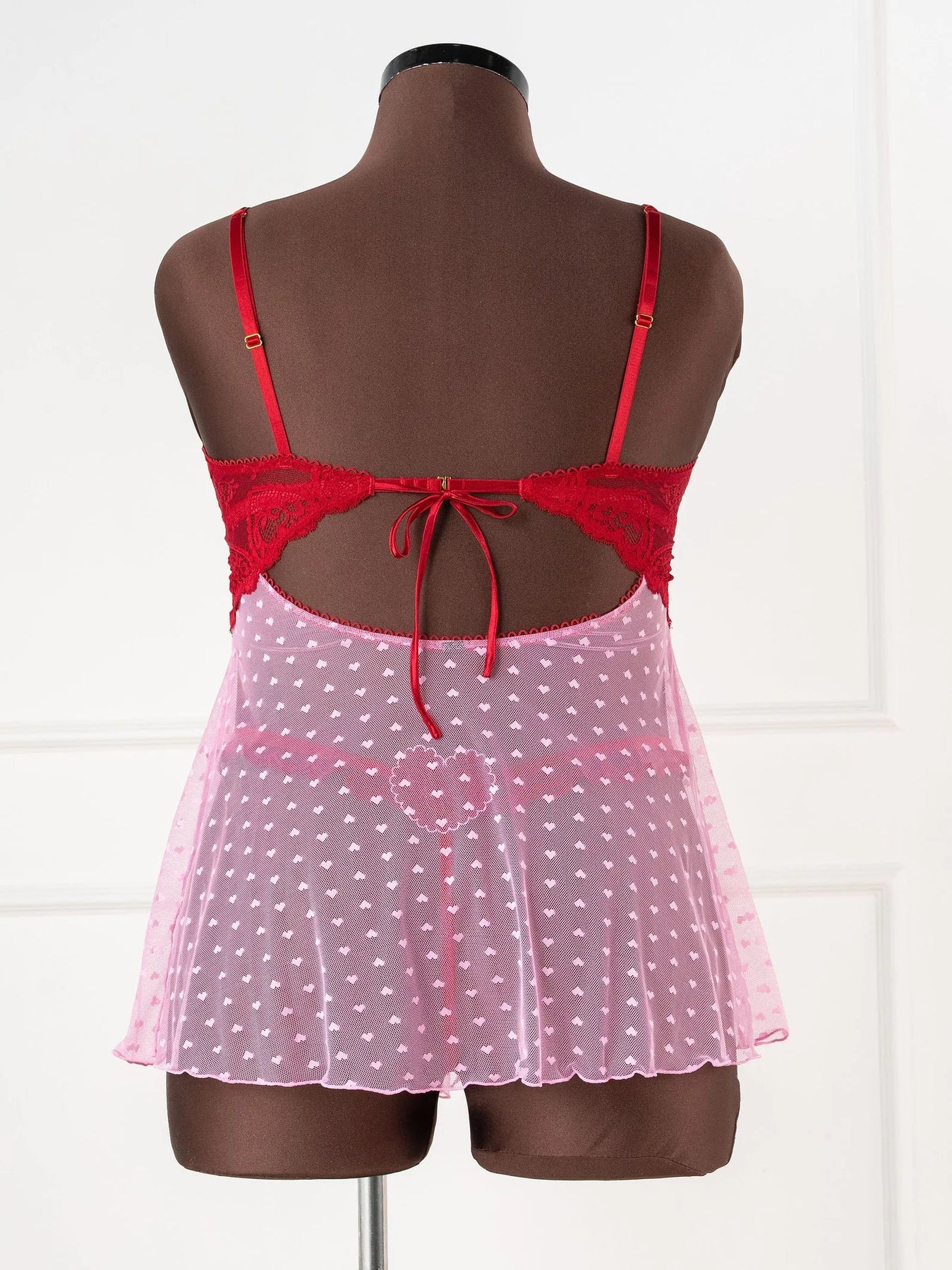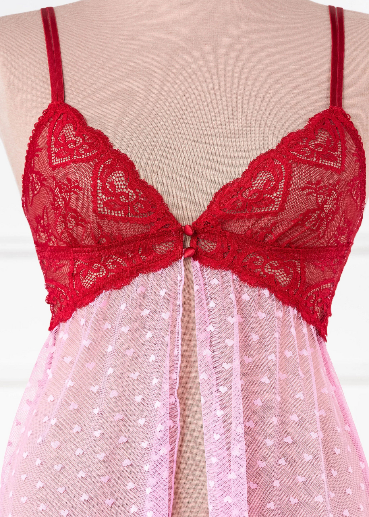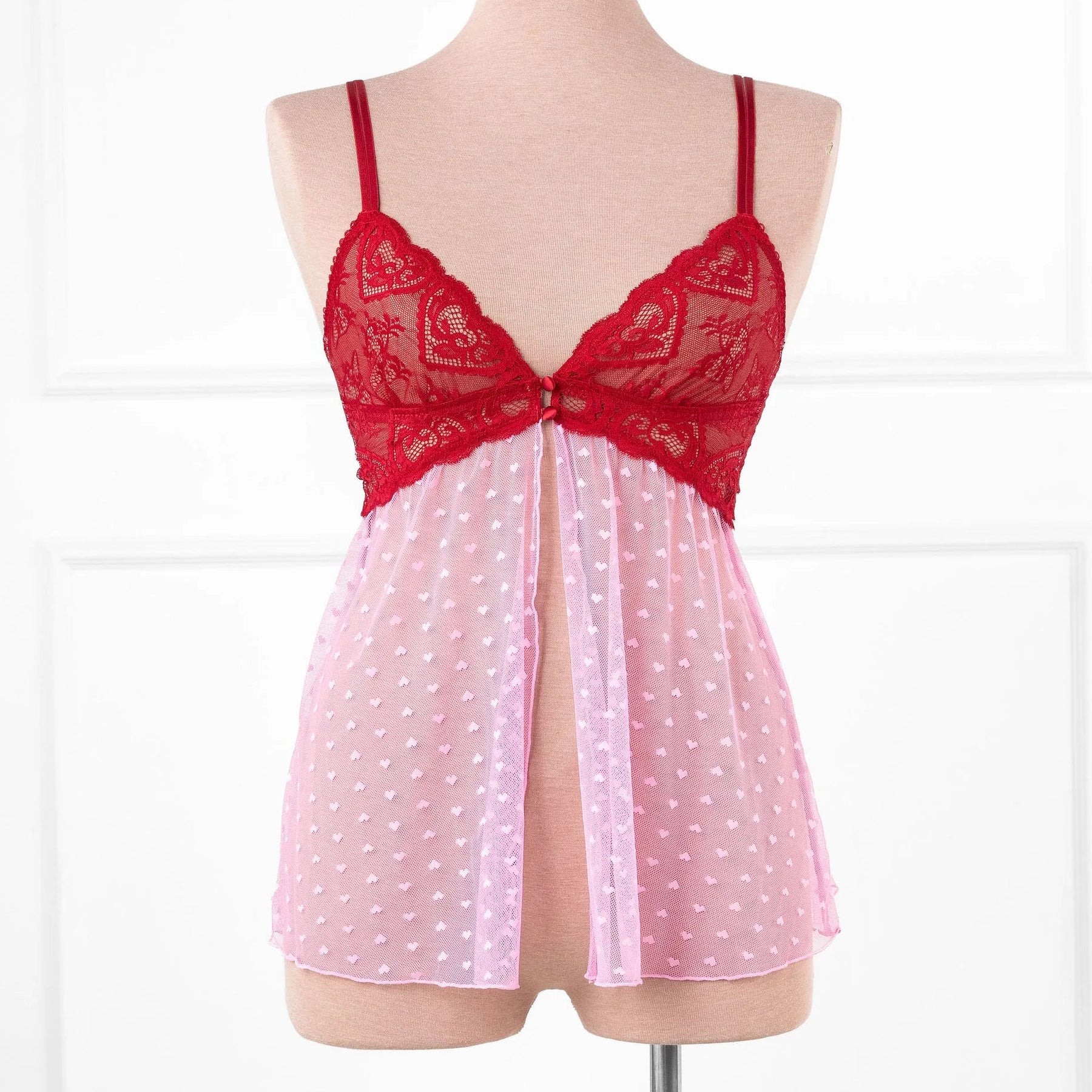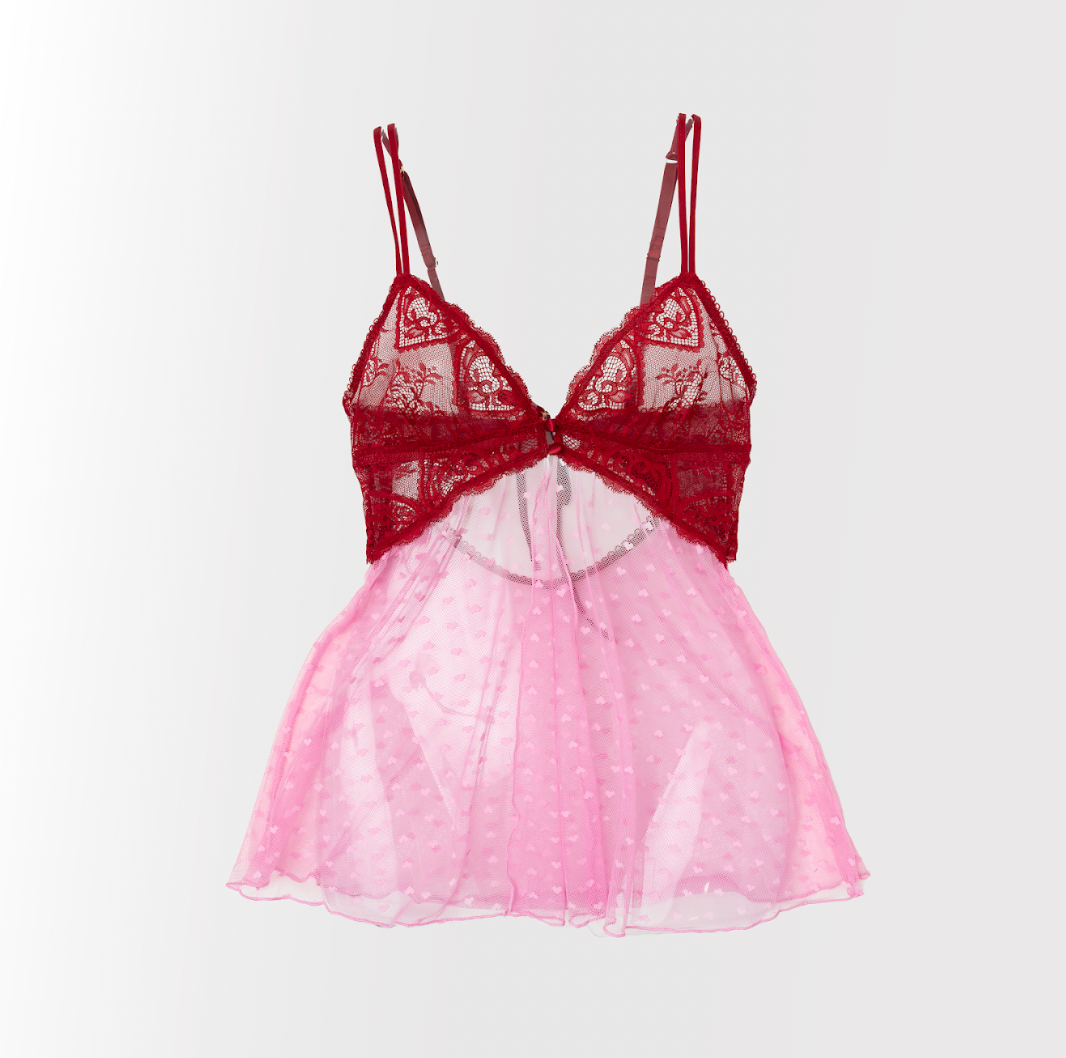Light, romantic, and effortlessly flattering. This adjustable-strap babydoll features a hidden center-back slider with a sweet satin bow, scalloped heart lace along the front and back neckline, and a slit front skirt for easy, breezy flow. Designed to flatter both smaller and fuller busts.