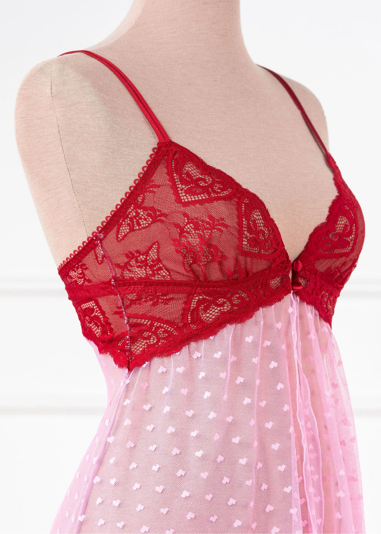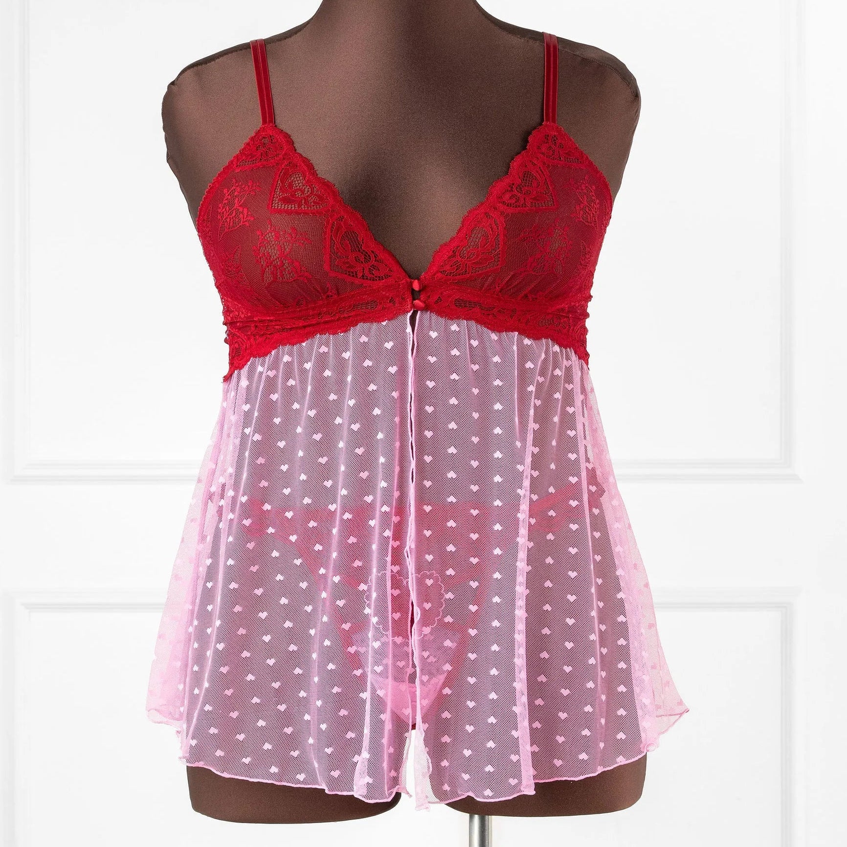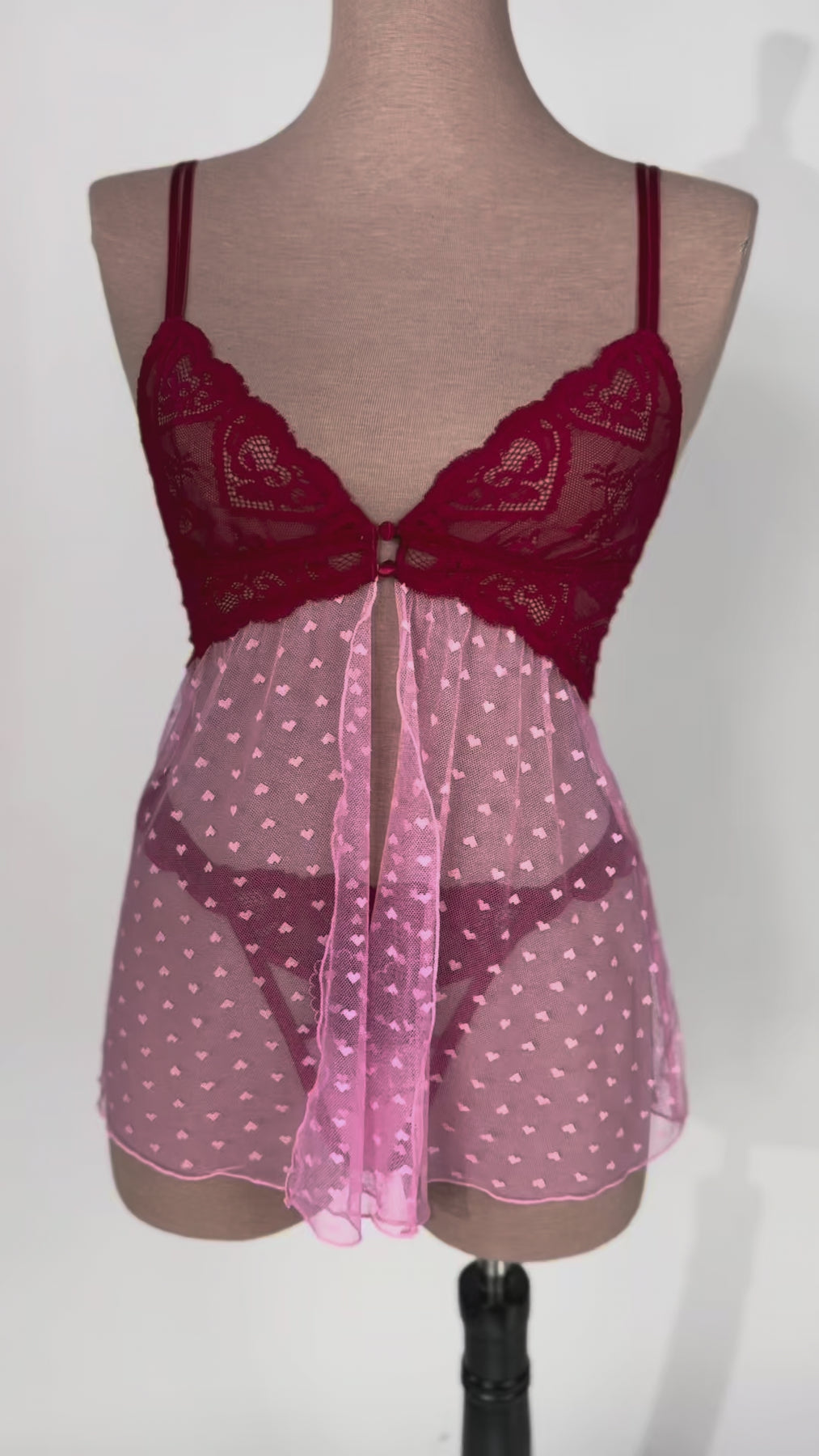 Light, romantic, and effortlessly flattering. This adjustable-strap babydoll features a hidden center-back slider with a sweet satin bow, scalloped heart lace along the front and back neckline, and a slit front skirt for easy, breezy flow. Designed to flatter both smaller and fuller busts.