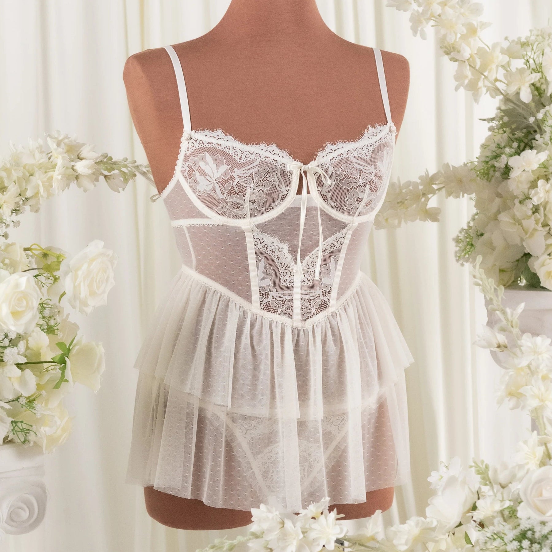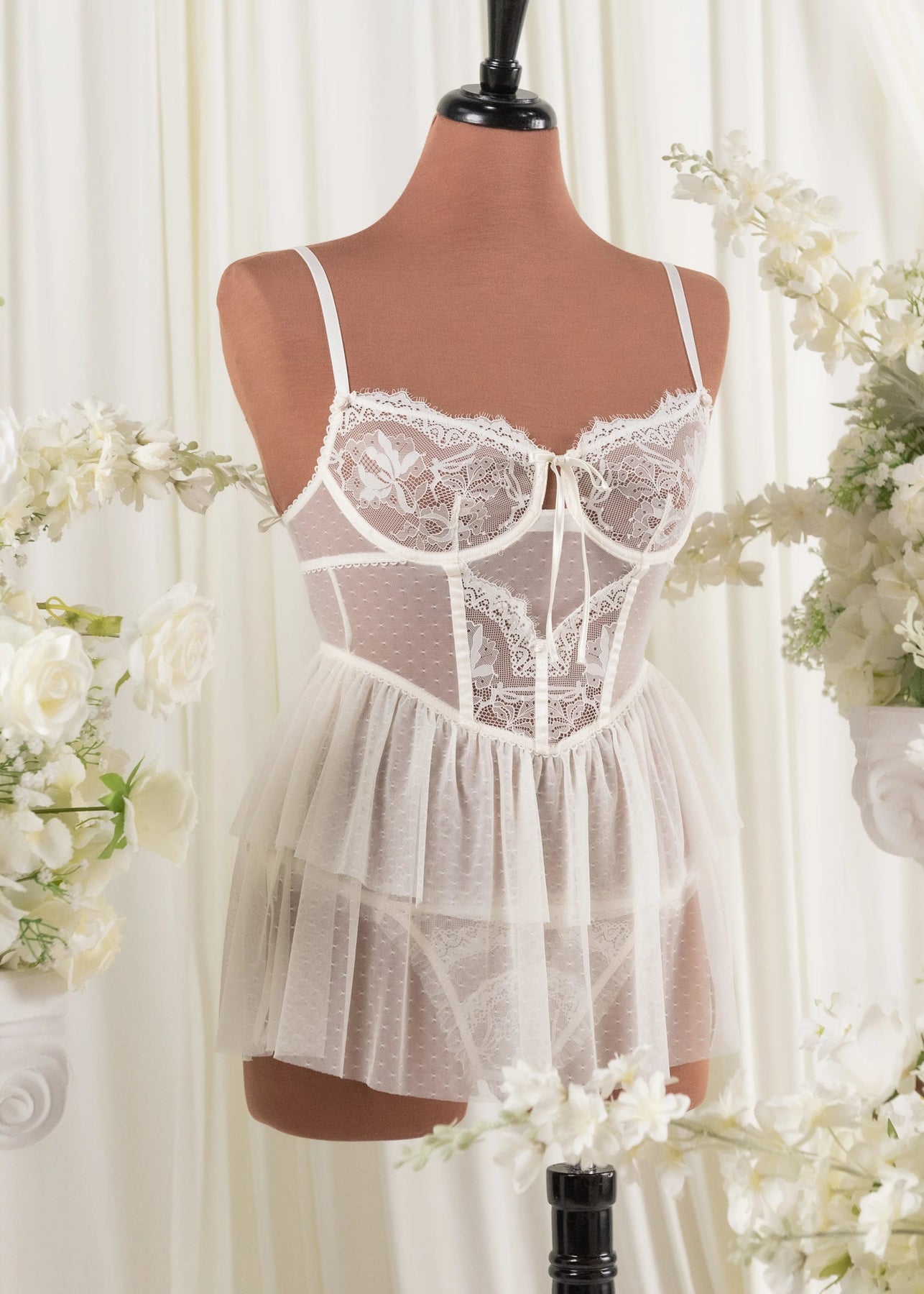 Add a touch of romance to your top drawer. This bustier-style babydoll is designed with underwire and boning for added support, and flowy layers of micro-dot mesh below.