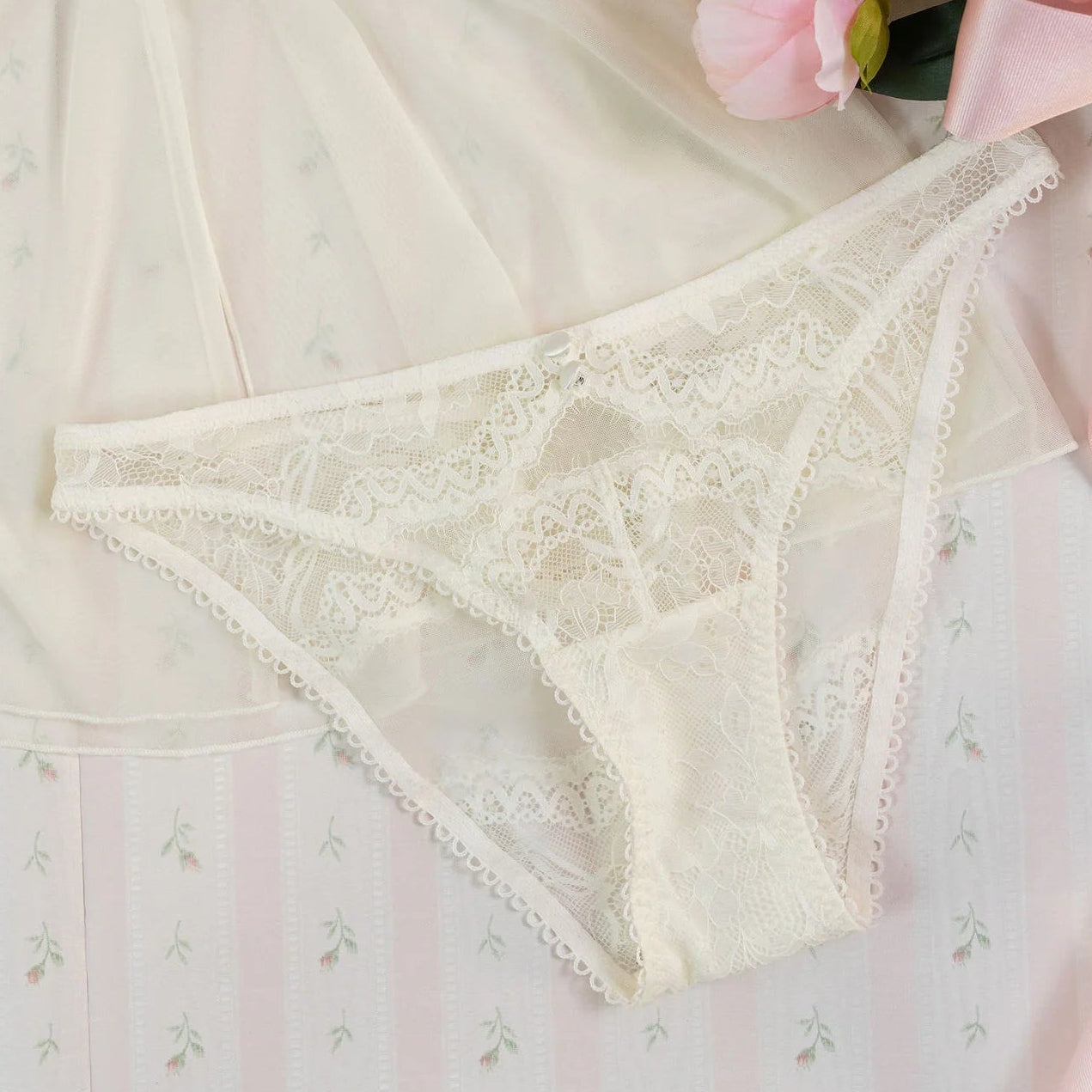 A lace and mesh panty featuring satin covered buttons and a functional satin bow at back to help become perfectly tailored to your body. Can be worn across the hips or higher on the hips.