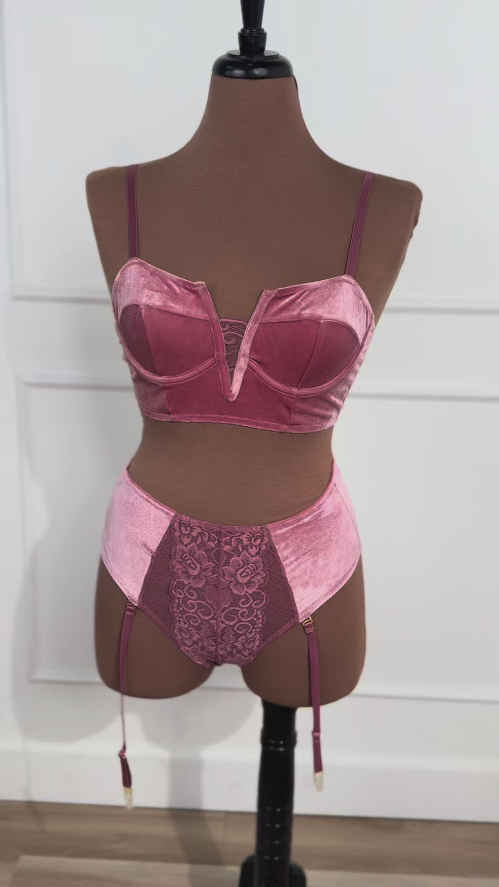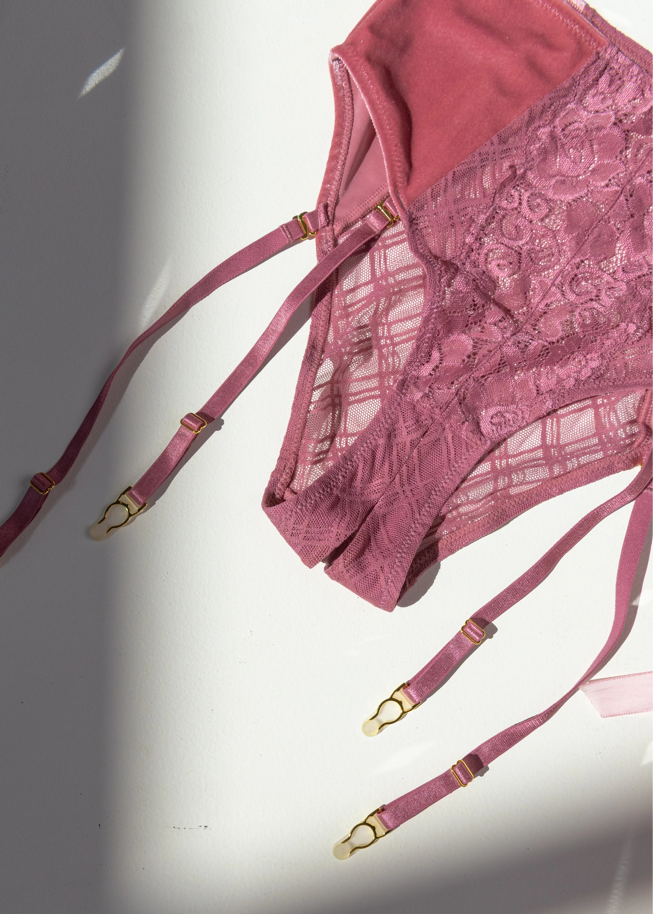 High Waist Velvet Crotchless Garter Panty - Sugarplum Pink