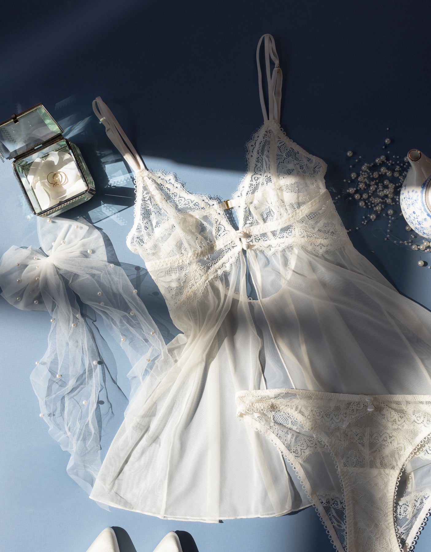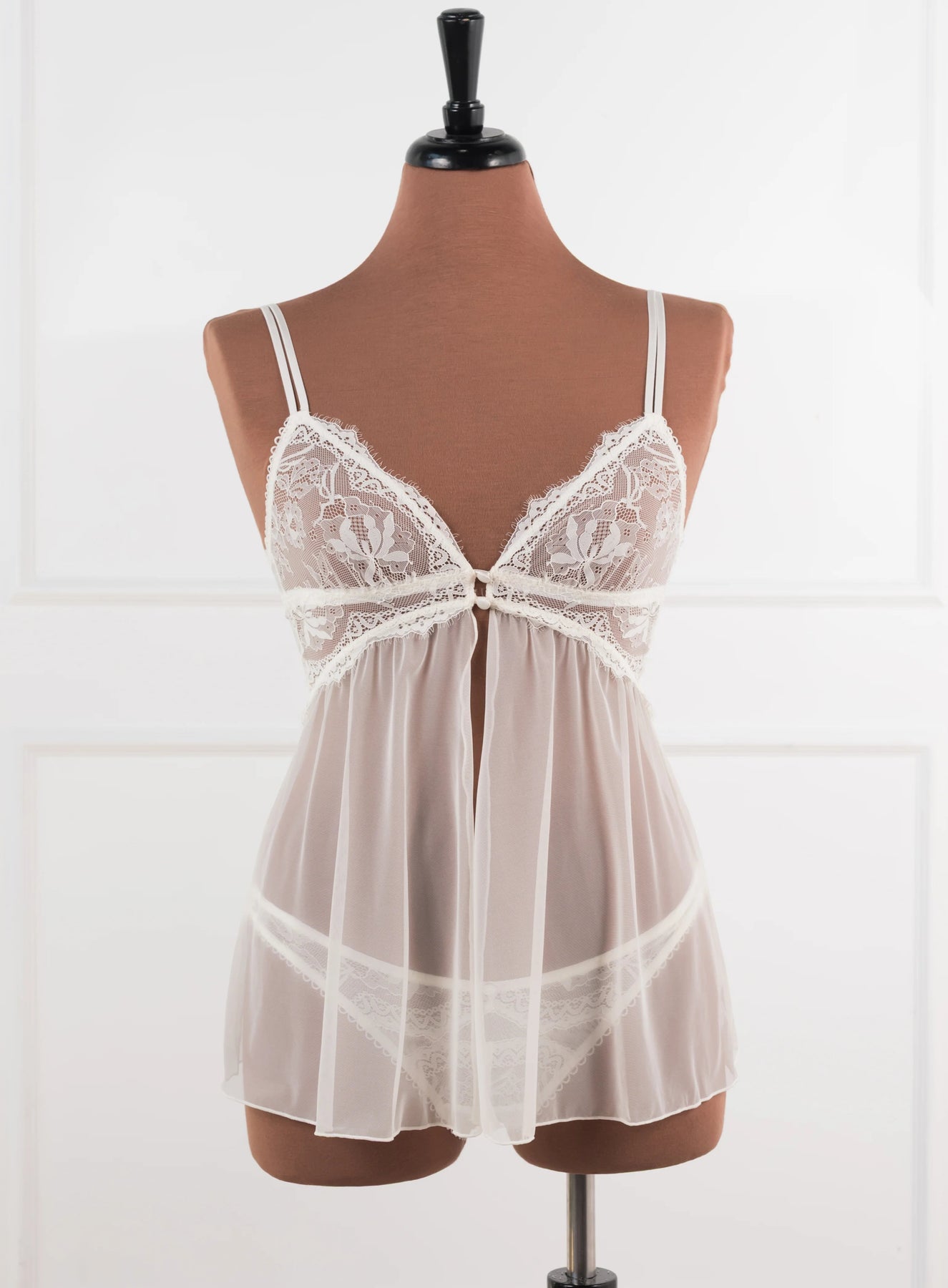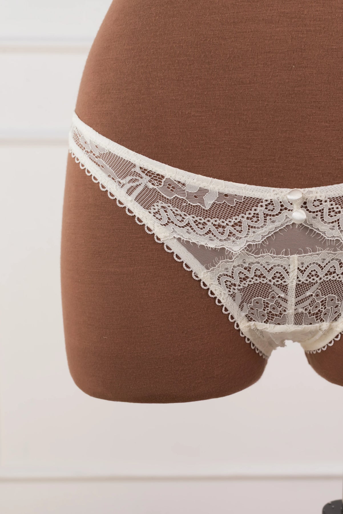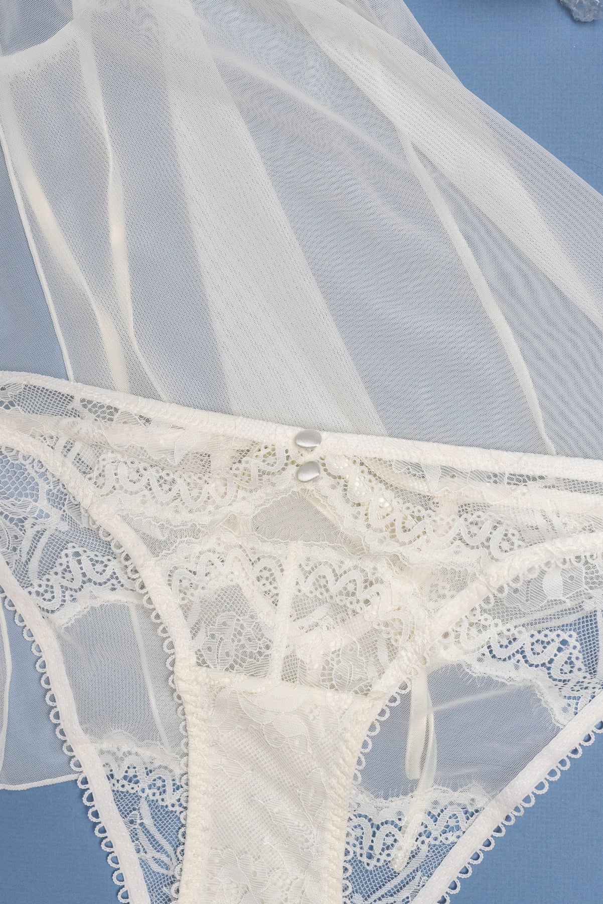 A lace and mesh panty featuring satin covered buttons and a functional satin bow at back to help become perfectly tailored to your body. Can be worn across the hips or higher on the hips.