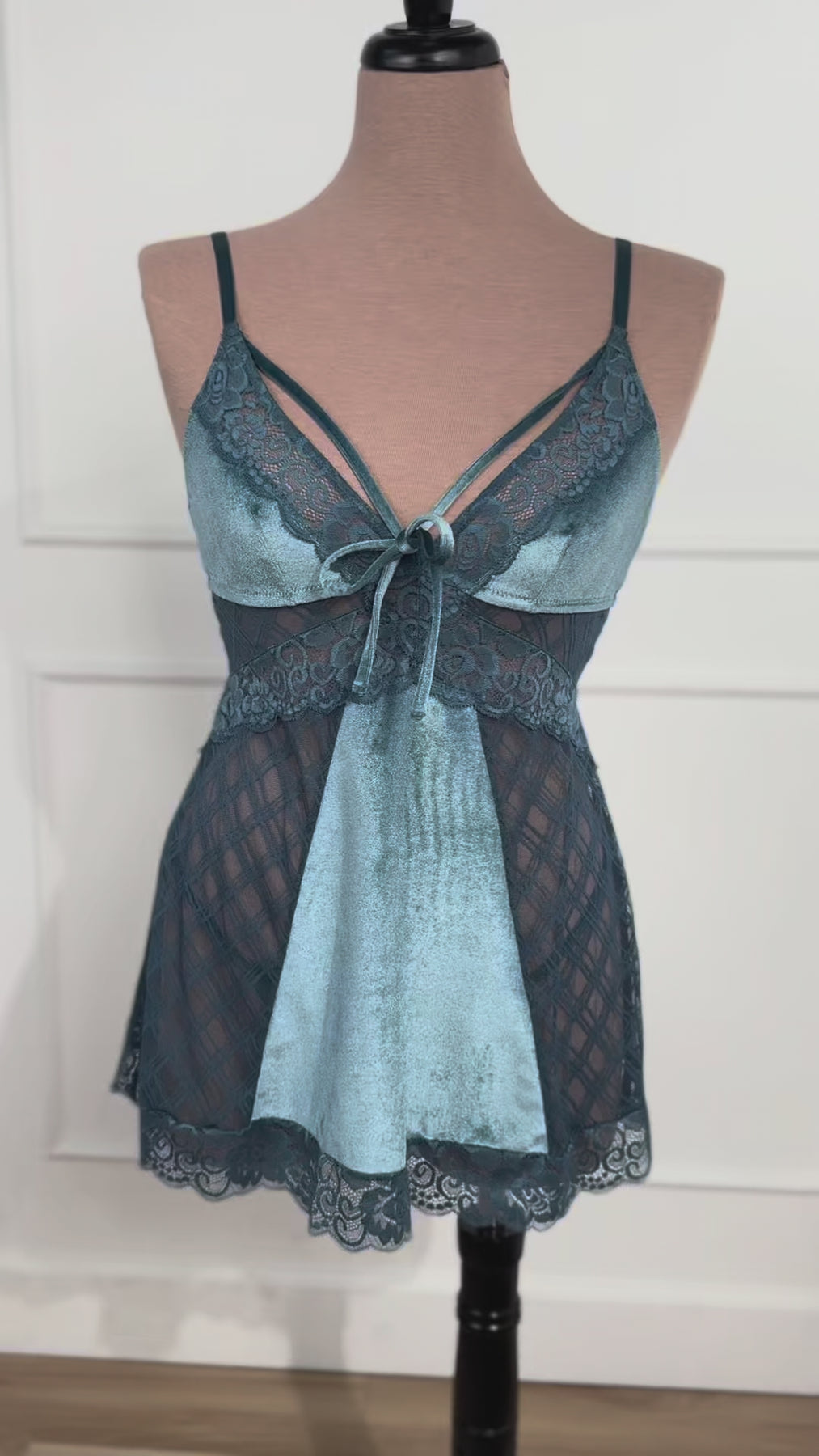 Lace & Velvet Strappy Babydoll - Retro Blue