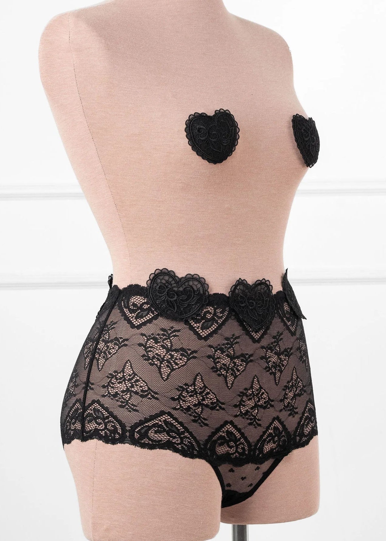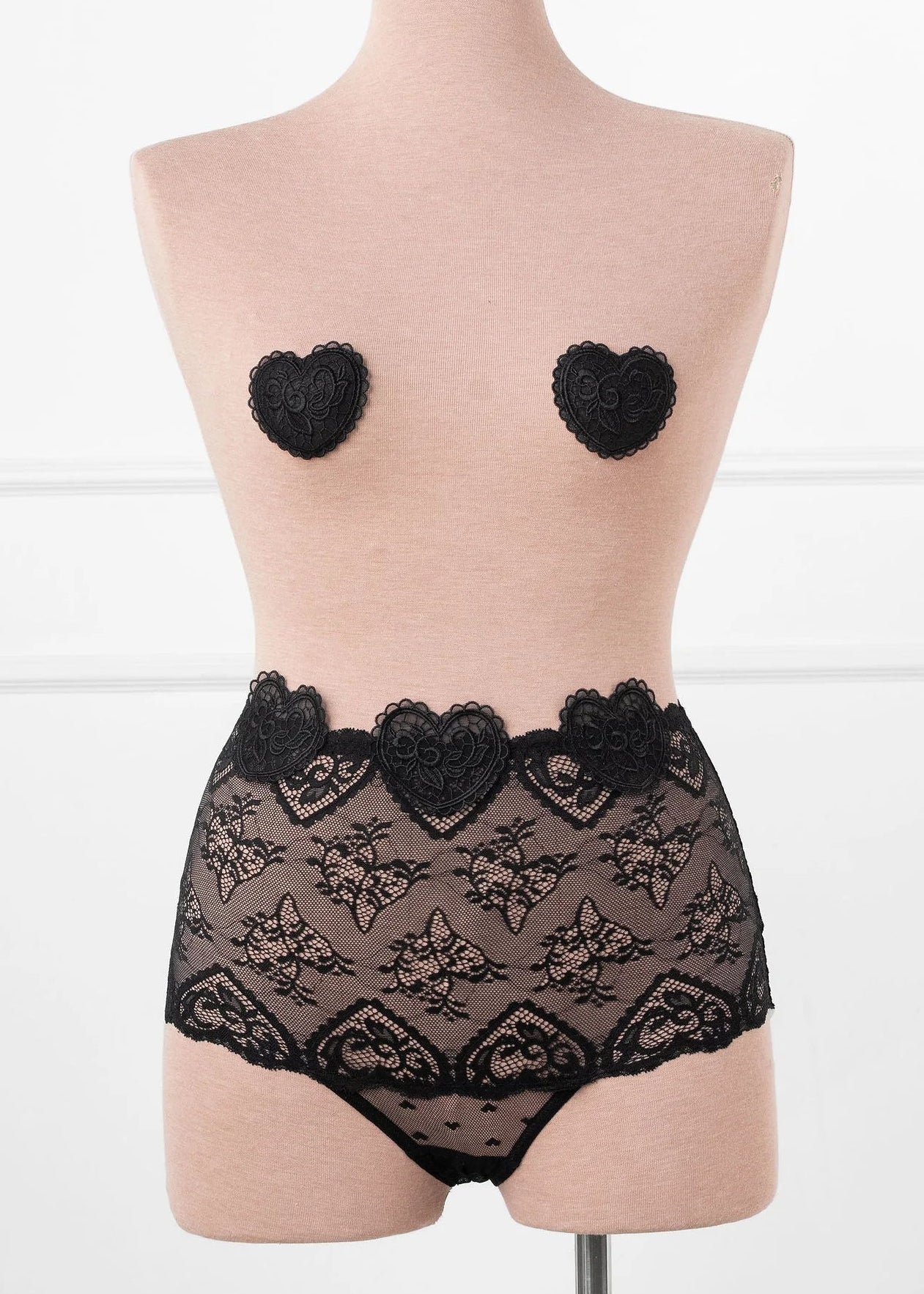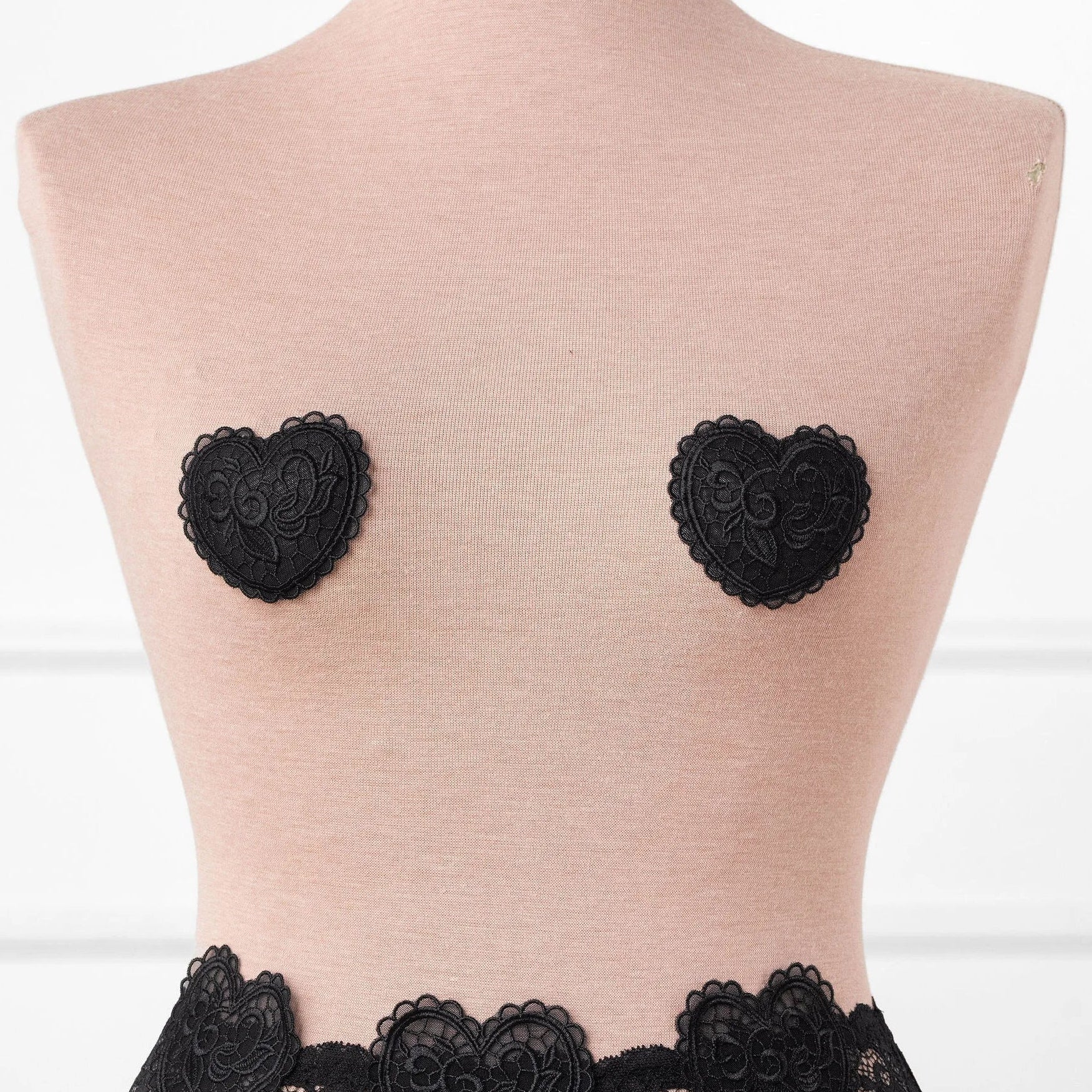 Sweet with a daring edge. These pasties are custom made from our signature heart lace to perfectly match our Valentine's Day Collection. One size fits all, easy to wear, and designed to add a playful little wink—because every queen knows the power of a well-placed heart. Pair them with our lingerie cape and your favorite panty for the perfect look or layer them under your date night 'fit for some extra fun.