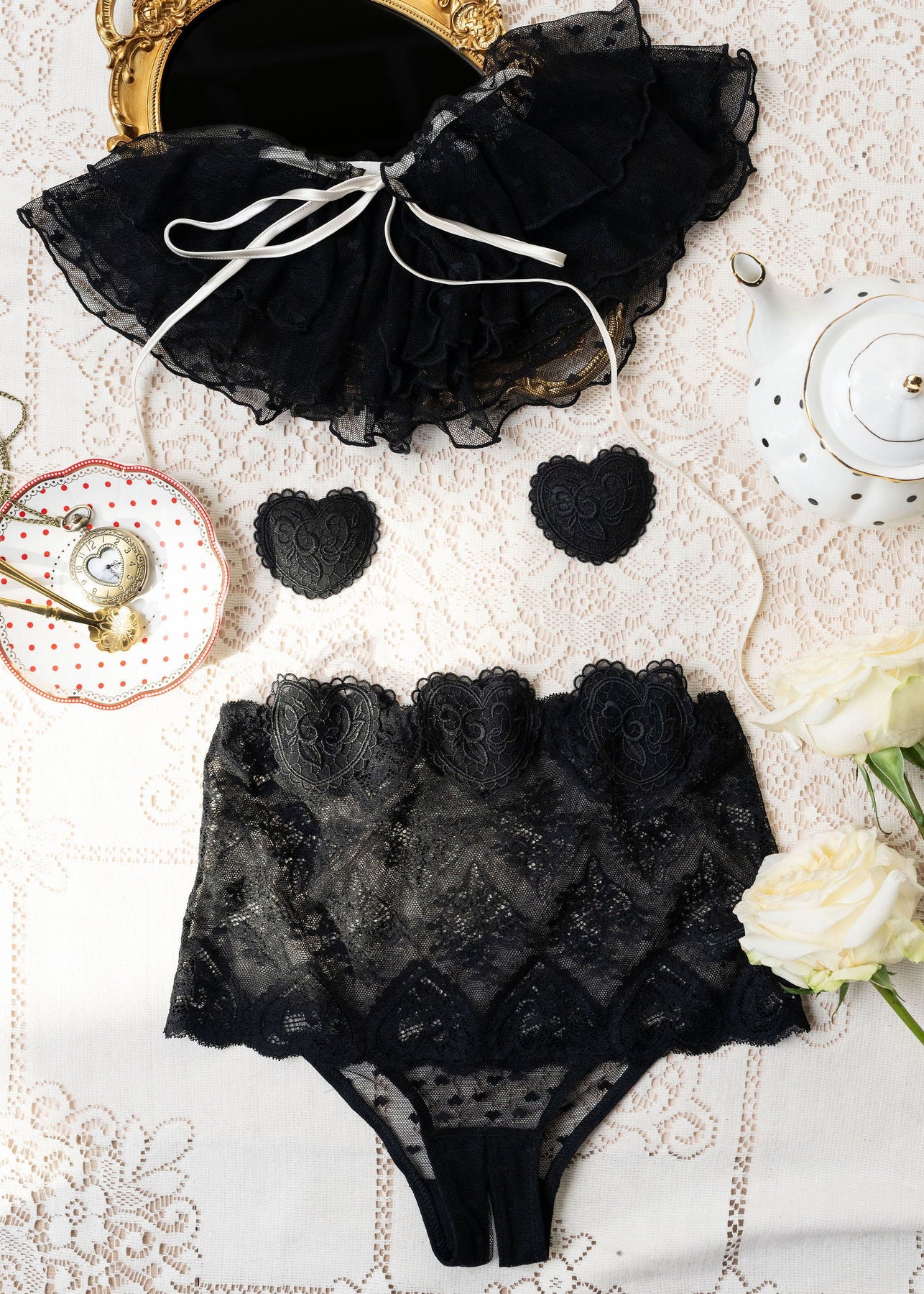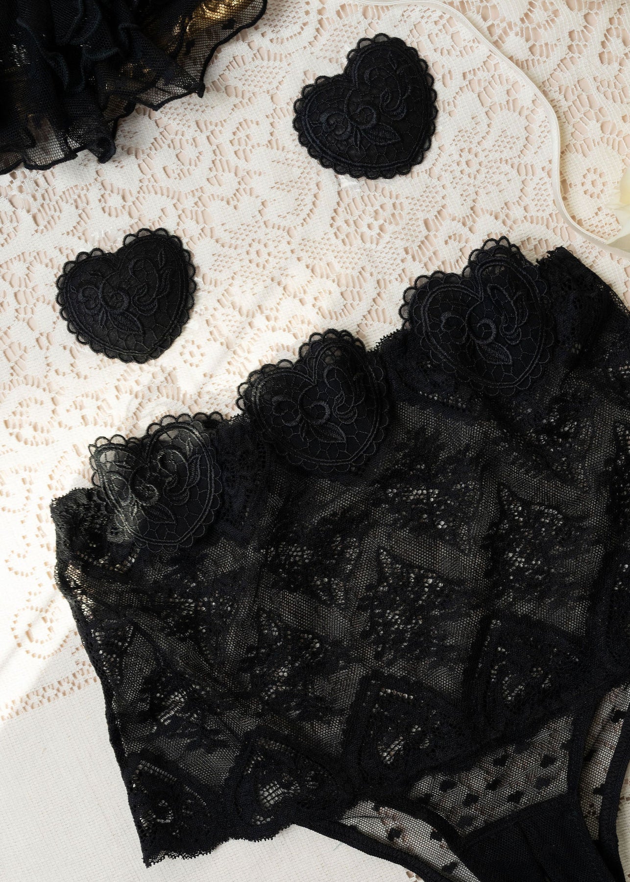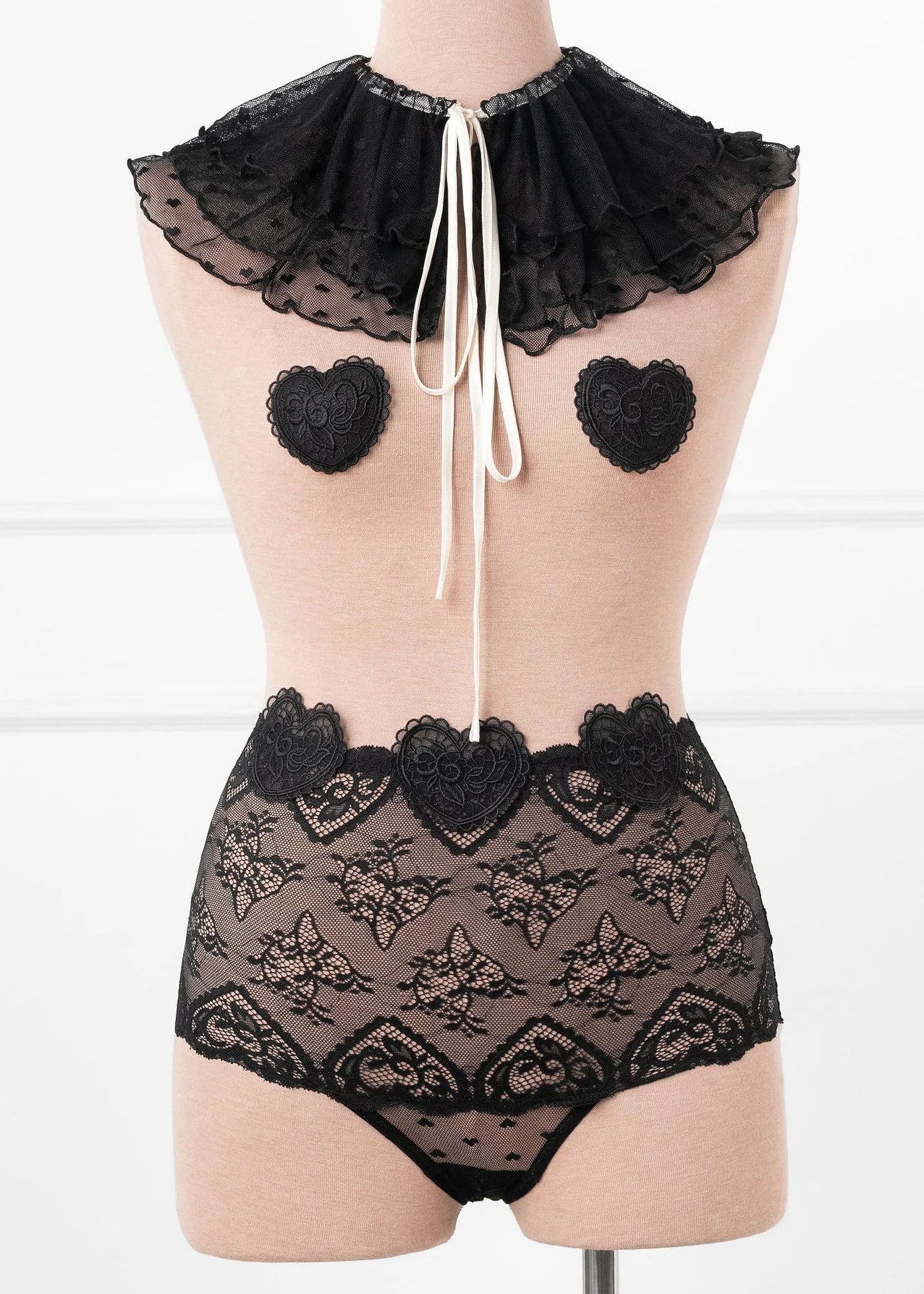 Sweet with a daring edge. These pasties are custom made from our signature heart lace to perfectly match our Valentine's Day Collection. One size fits all, easy to wear, and designed to add a playful little wink—because every queen knows the power of a well-placed heart. Pair them with our lingerie cape and your favorite panty for the perfect look or layer them under your date night 'fit for some extra fun.
