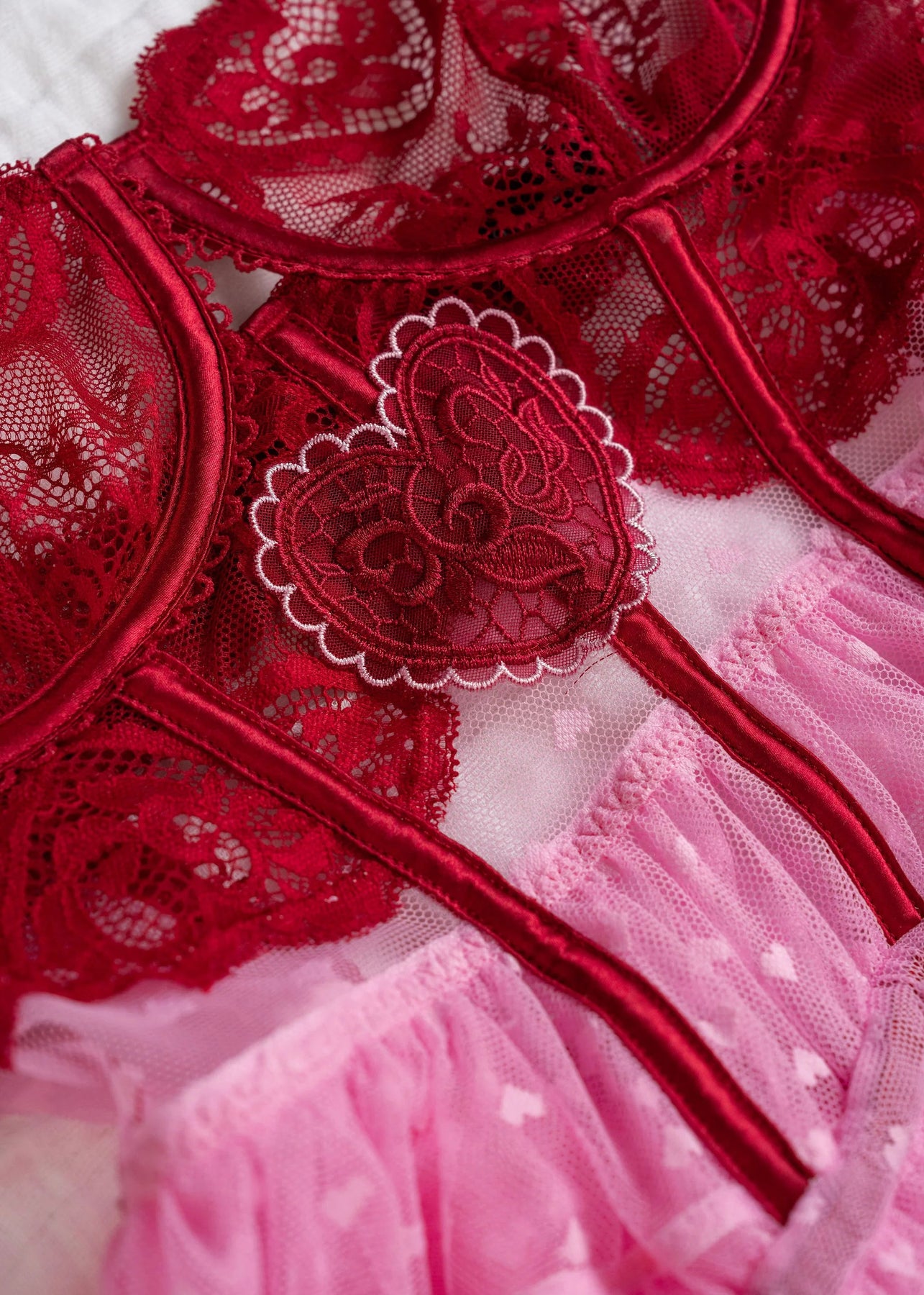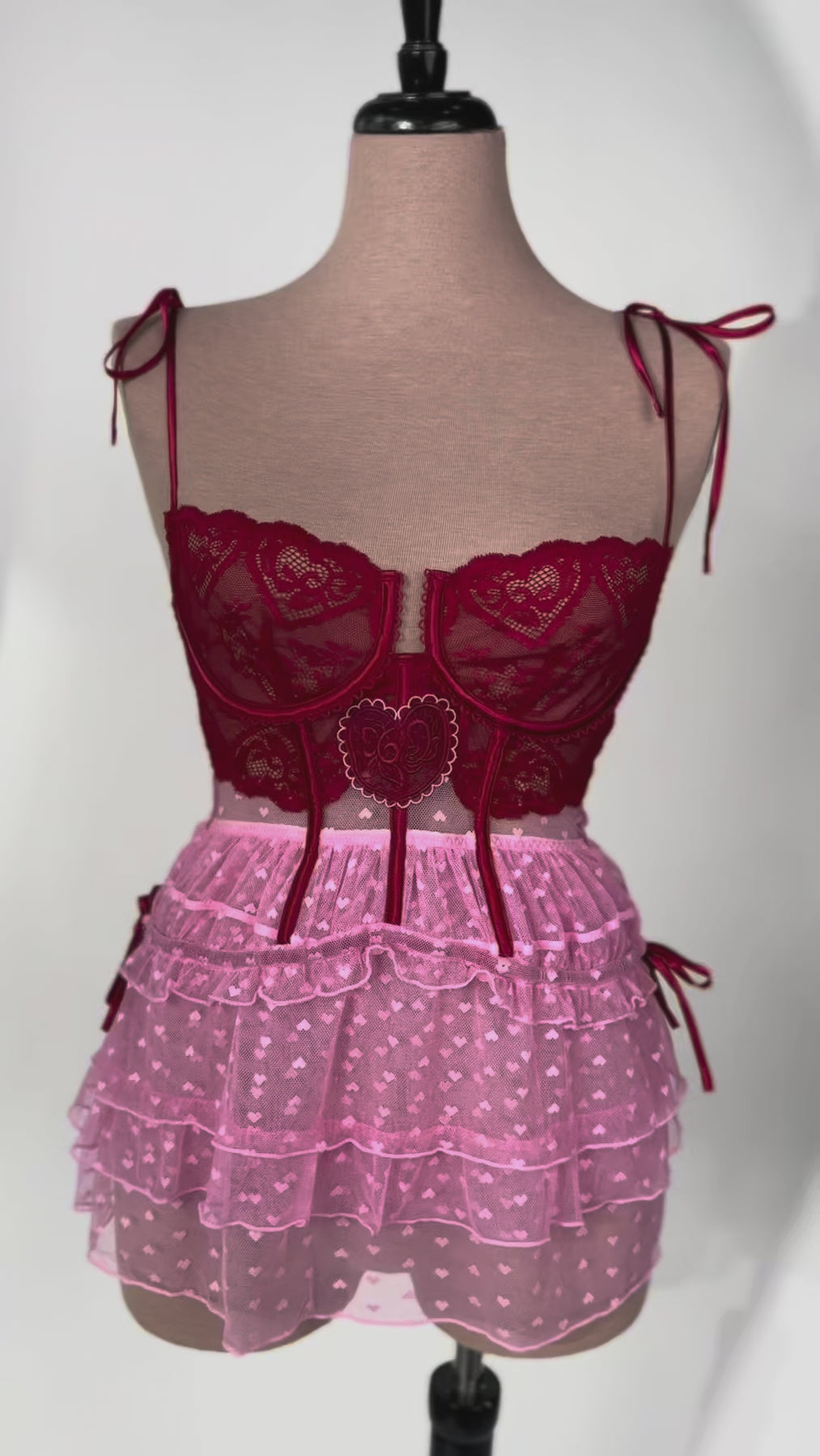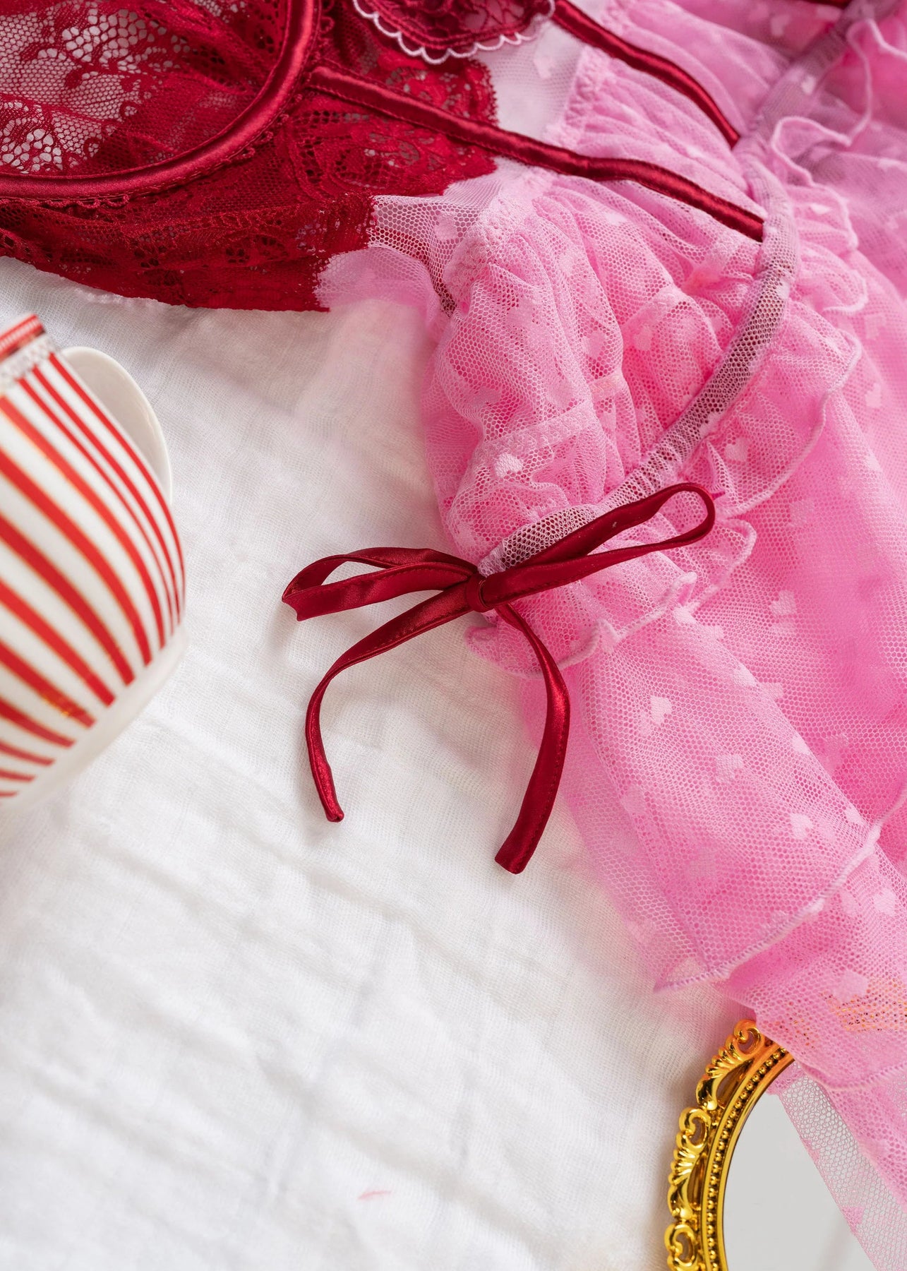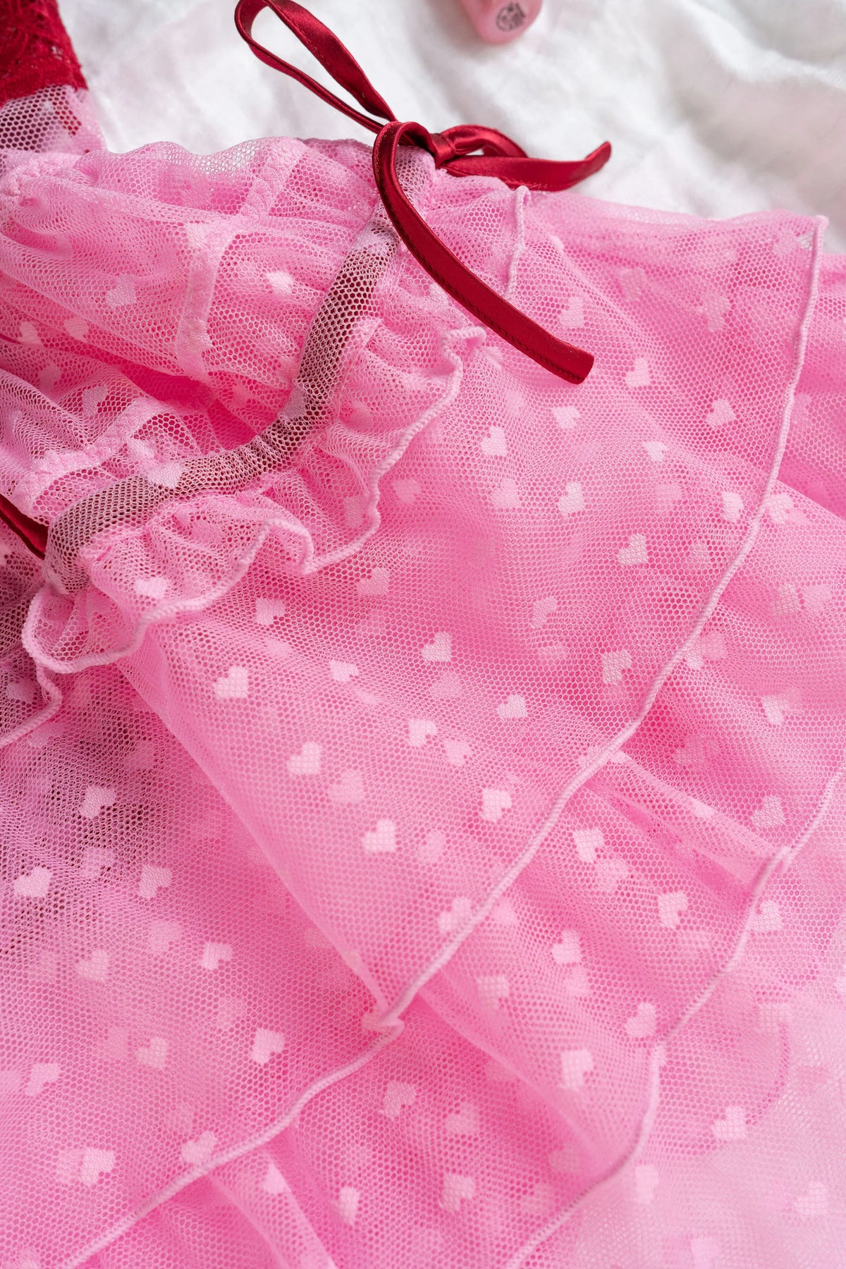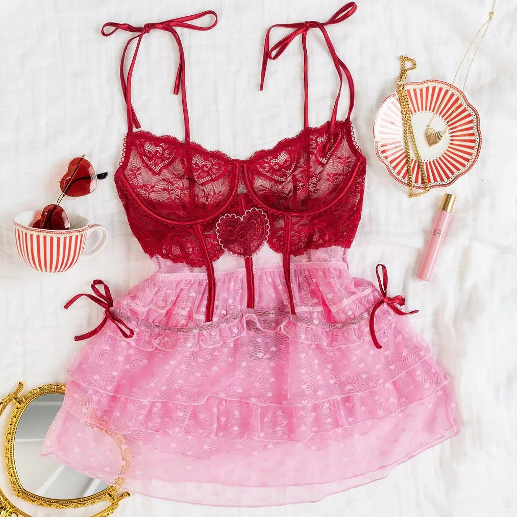 A flirty, corset-inspired babydoll with supportive underwire, a ruched drop waist with adjustable satin ties to get the perfect fit, and tiered heart-mesh layers that flutter with every move. Adjustable satin tie straps and sweet heart appliqués at front and back seal the deal—playful, flattering, and made to rule (especially for fuller busts).
