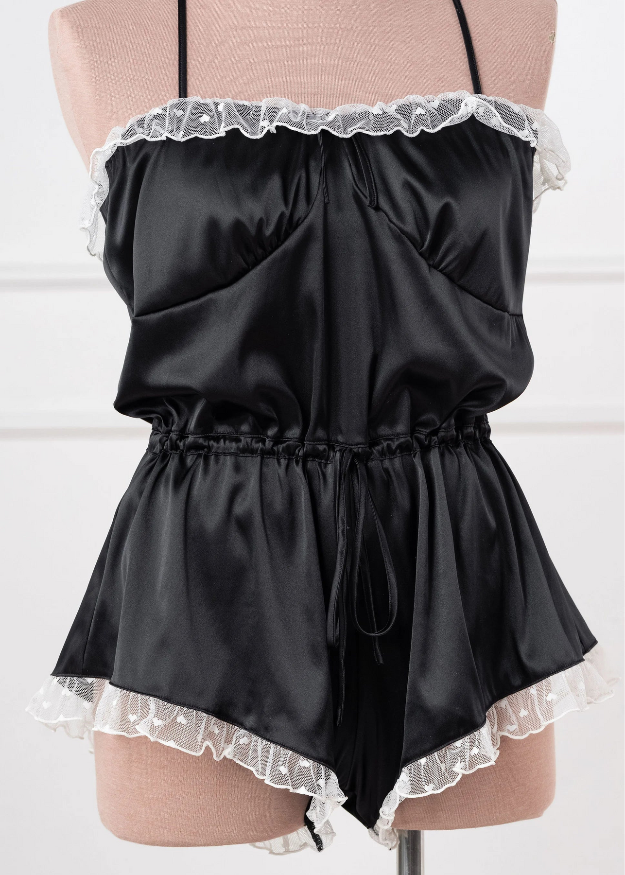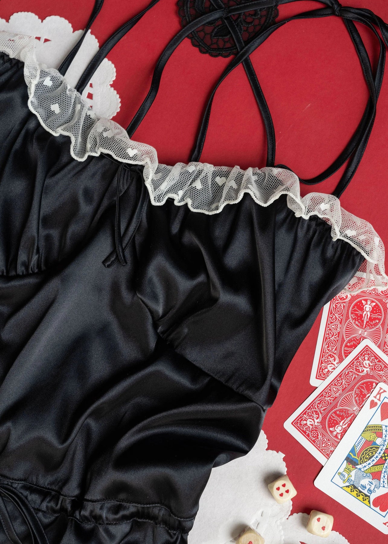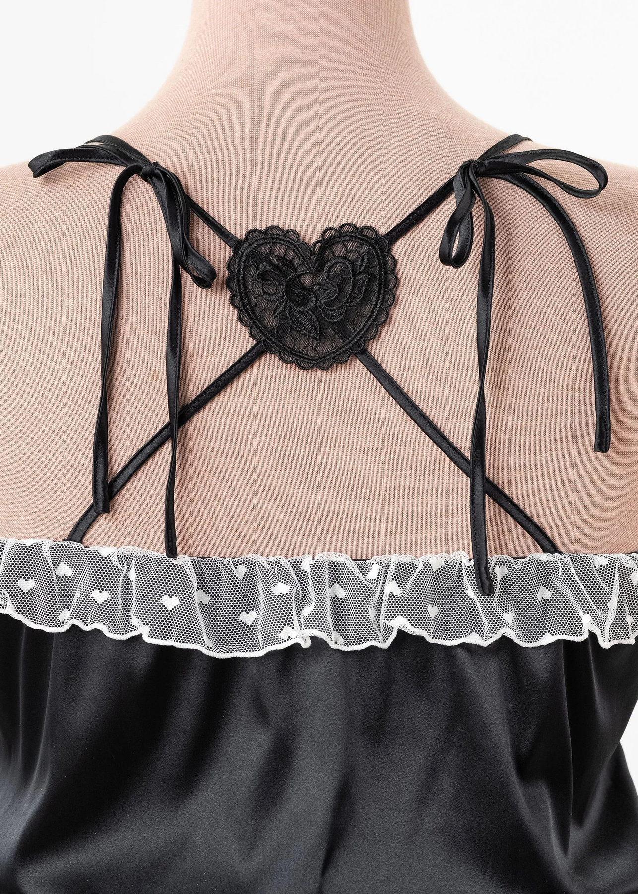 A soft nod to vintage Hollywood glamour, this piece is perfect to reach for while getting ready, setting the mood, or lingering in the afterglow. Dropped bust seams let everything fall naturally, while a functional waistband lets you adjust the blouson shape. Finished with adjustable satin shoulder ties and sweet heart appliqués at the back, it’s romance un-rushed and undone.