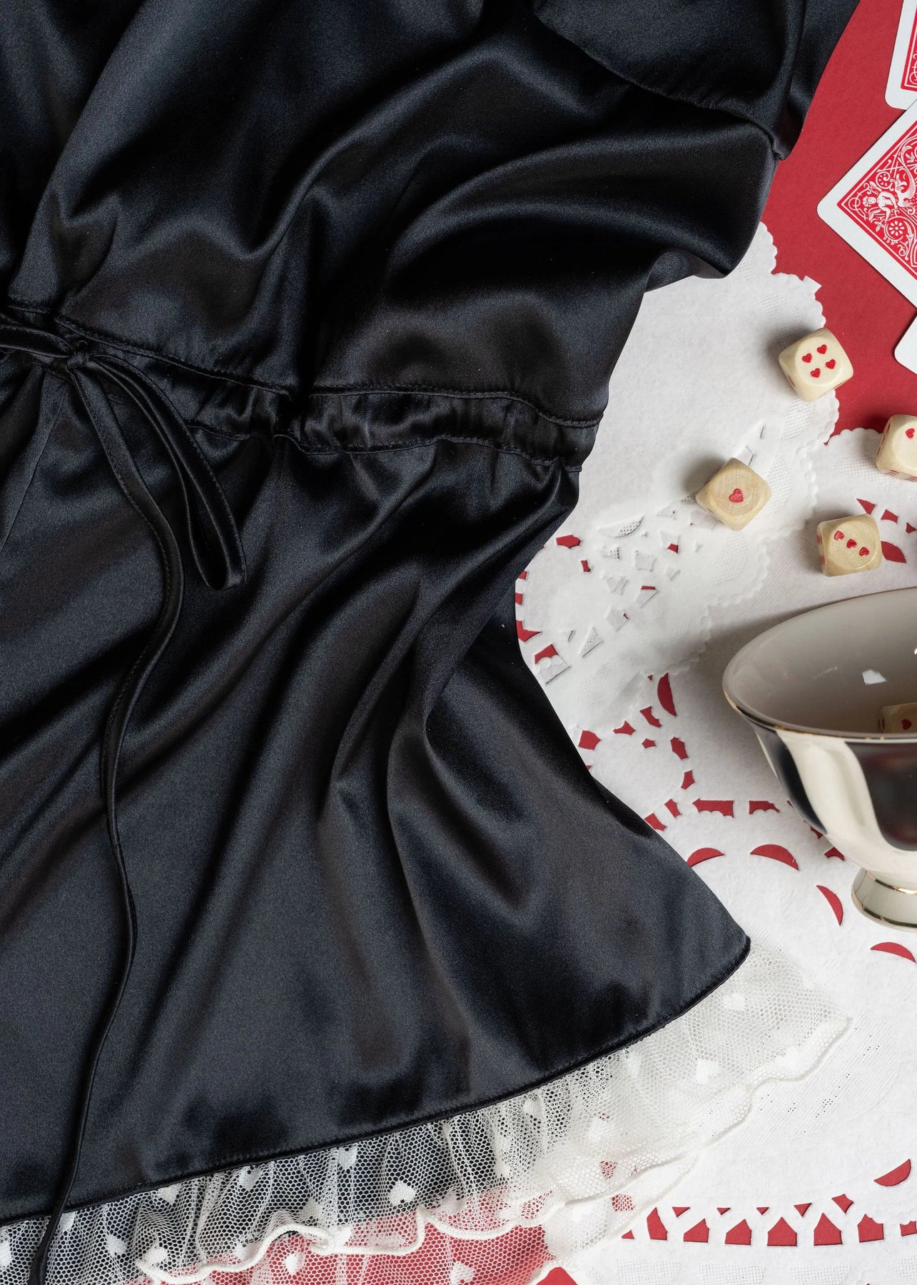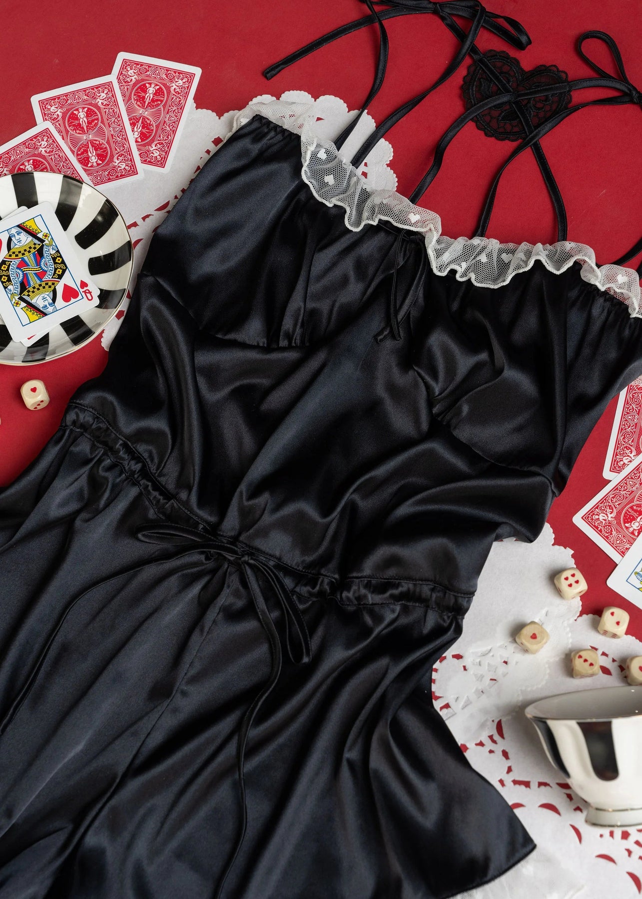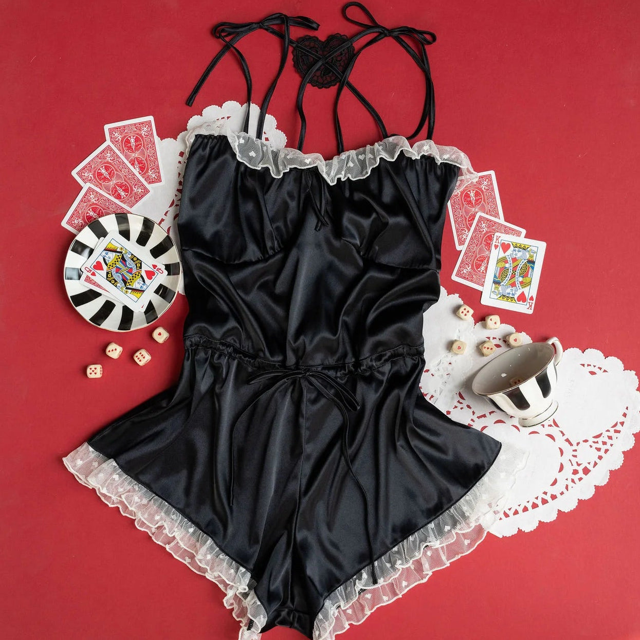 A soft nod to vintage Hollywood glamour, this piece is perfect to reach for while getting ready, setting the mood, or lingering in the afterglow. Dropped bust seams let everything fall naturally, while a functional waistband lets you adjust the blouson shape. Finished with adjustable satin shoulder ties and sweet heart appliqués at the back, it’s romance un-rushed and undone.