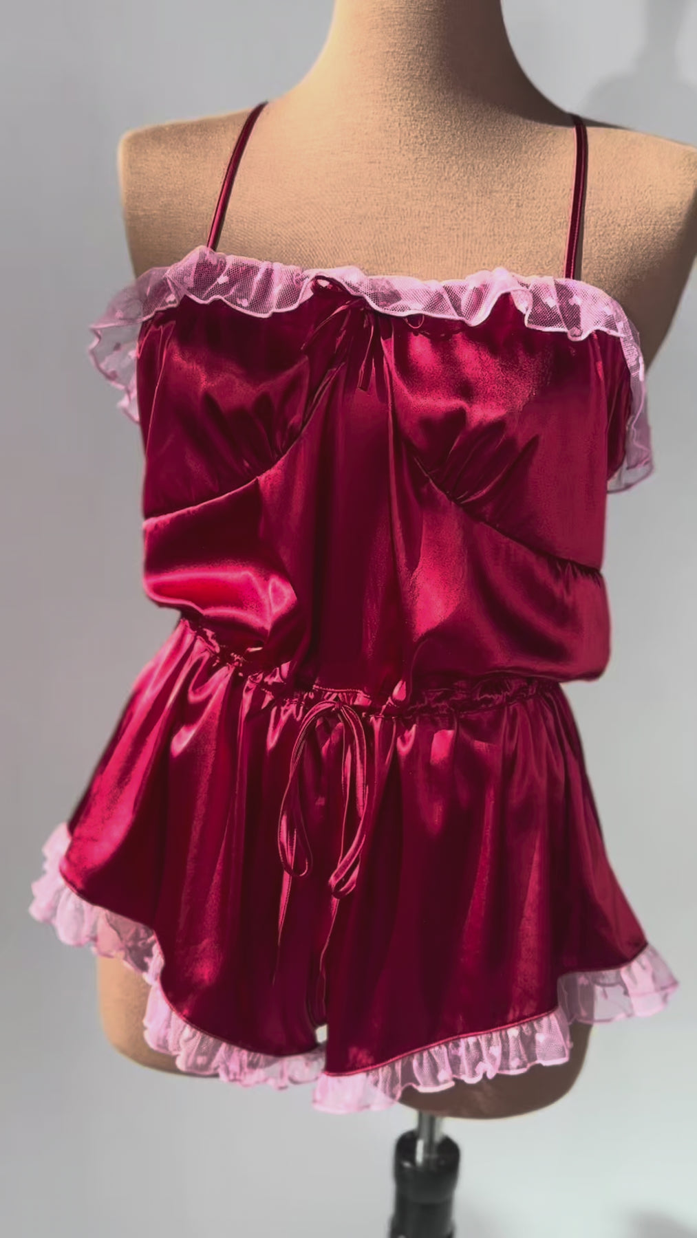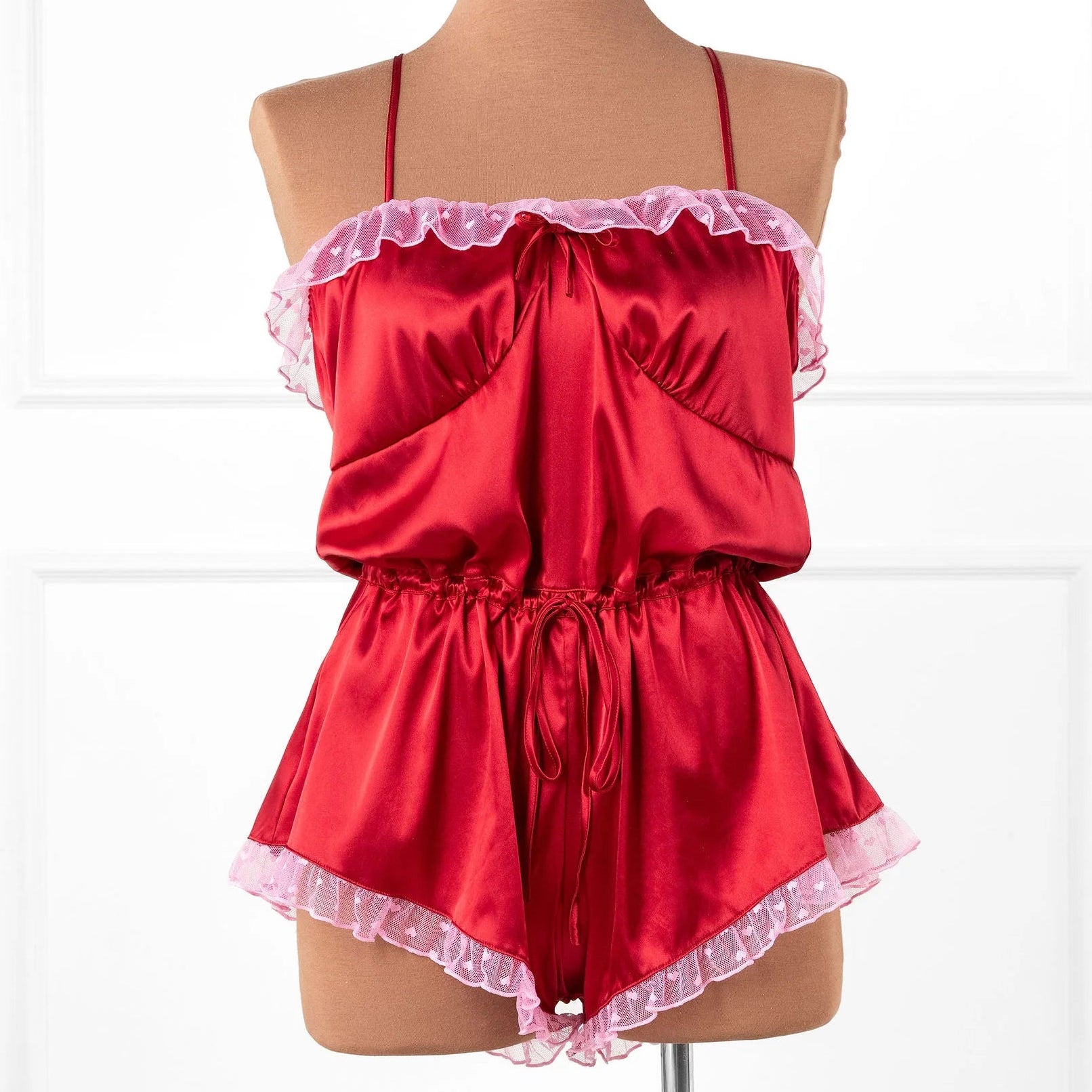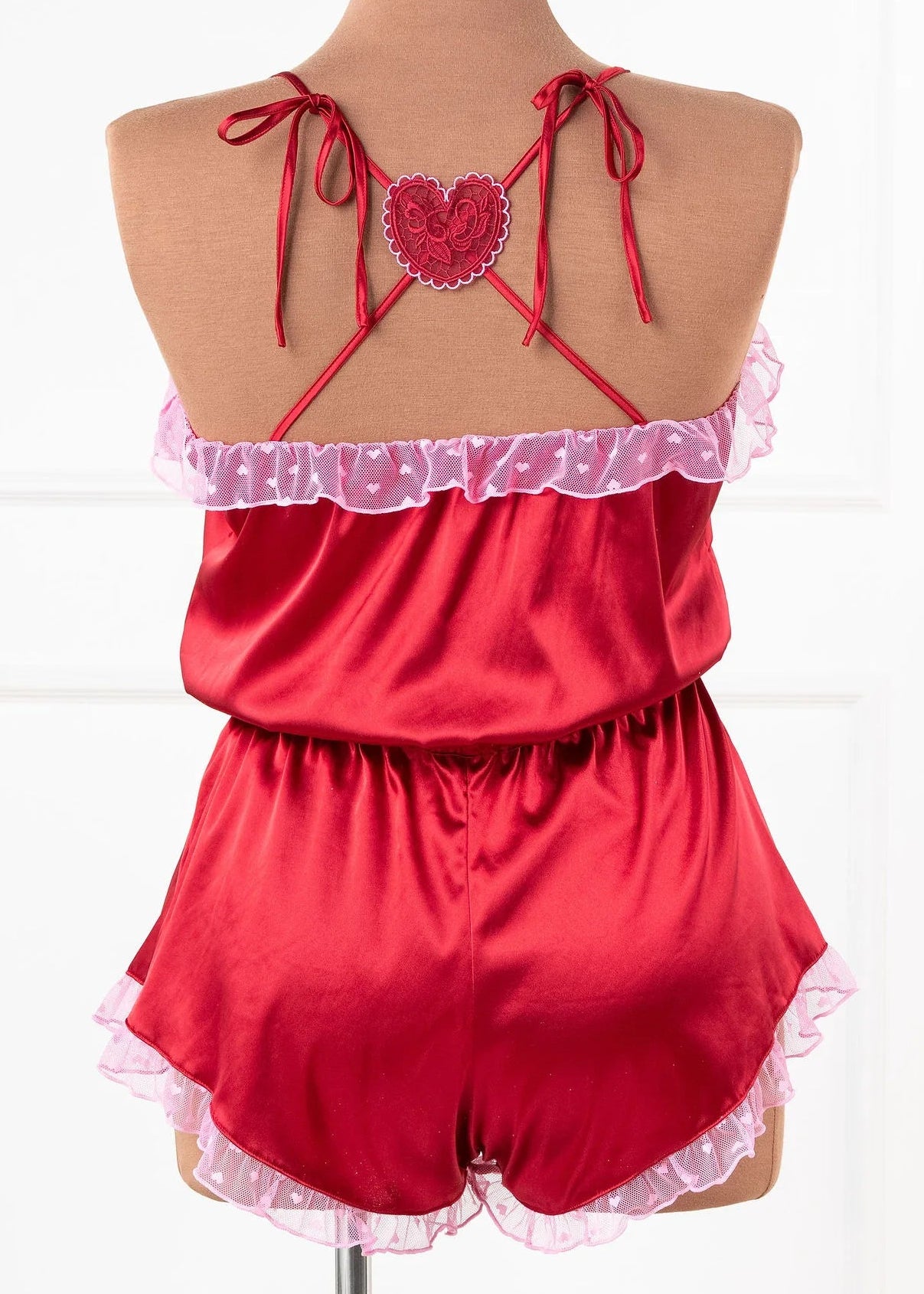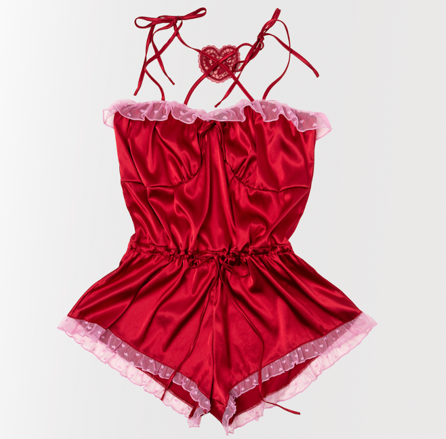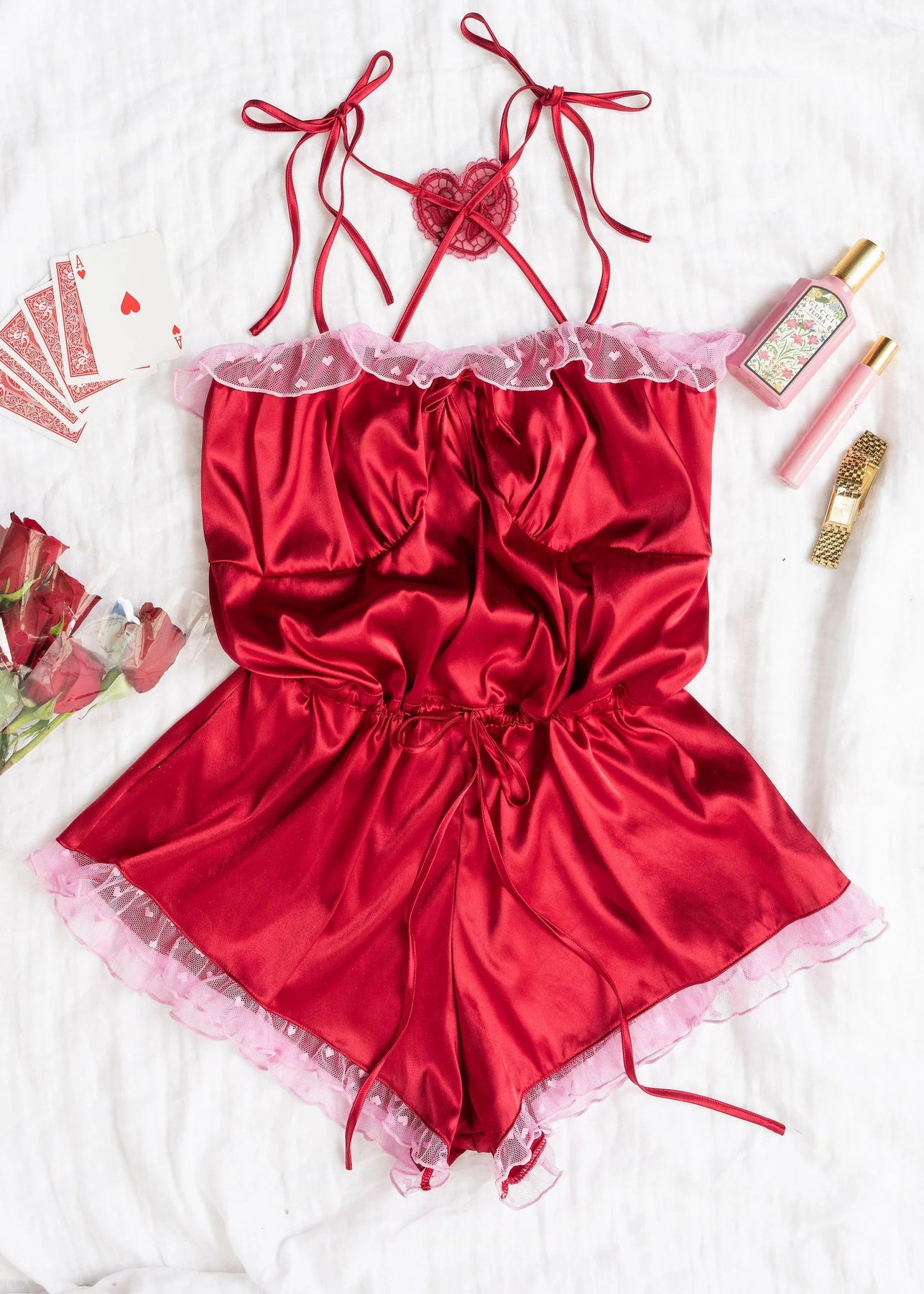 A soft nod to vintage Hollywood glamour, this piece is perfect to reach for while getting ready, setting the mood, or lingering in the afterglow. Dropped bust seams let everything fall naturally, while a functional waistband lets you adjust the blouson shape. Finished with adjustable satin shoulder ties and sweet heart appliqués at the back, it's romance unrushed and undone.